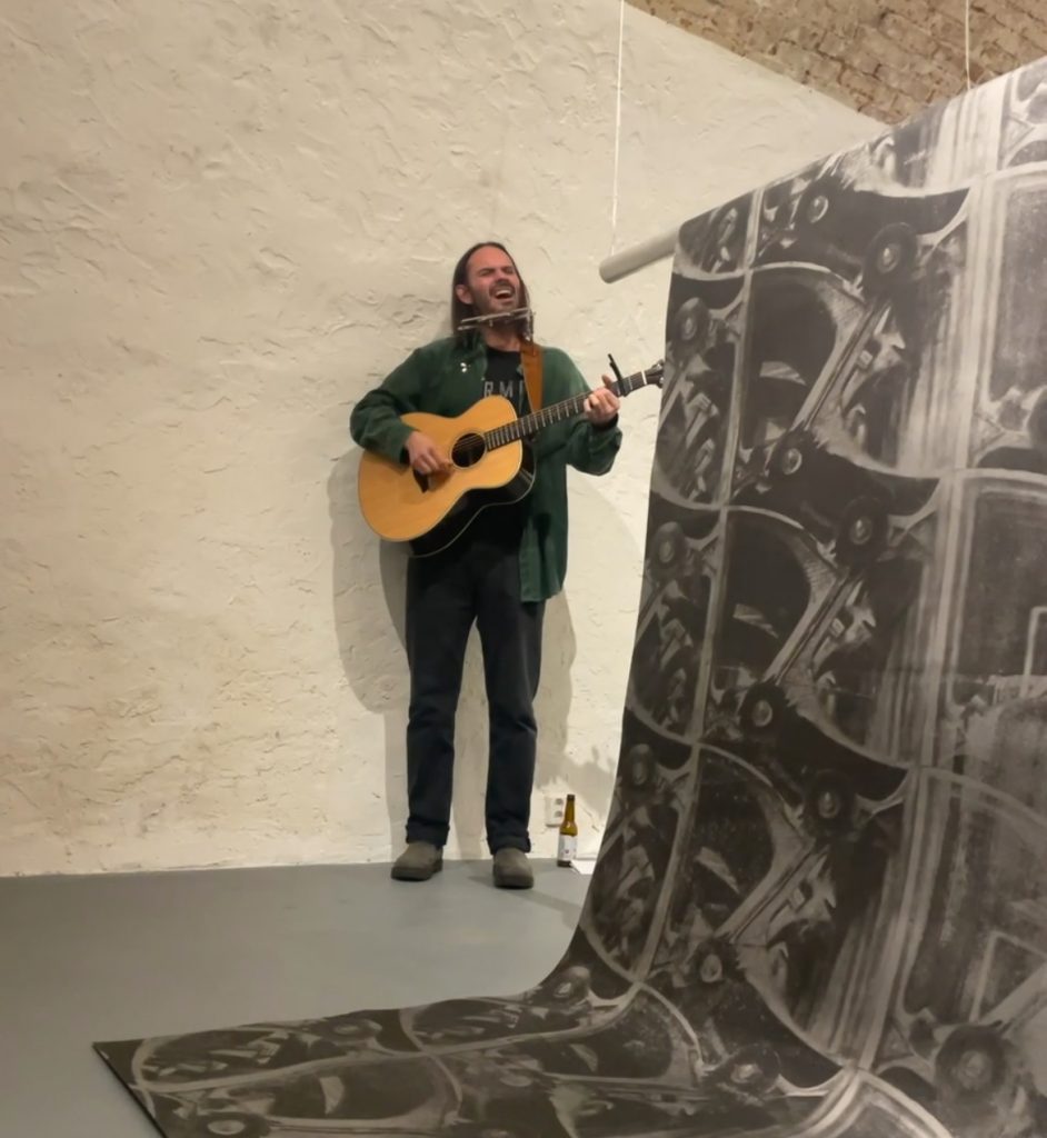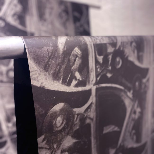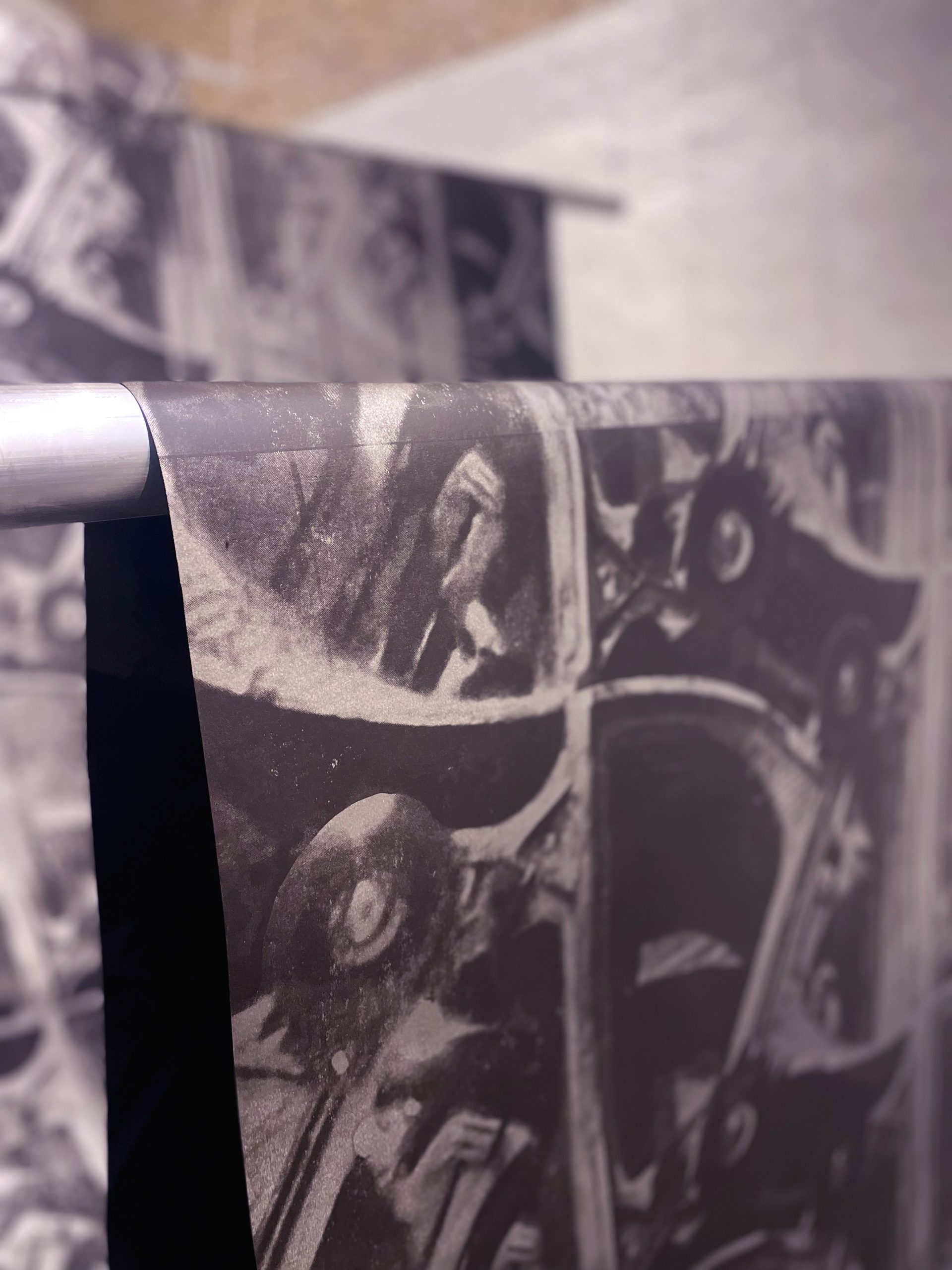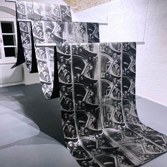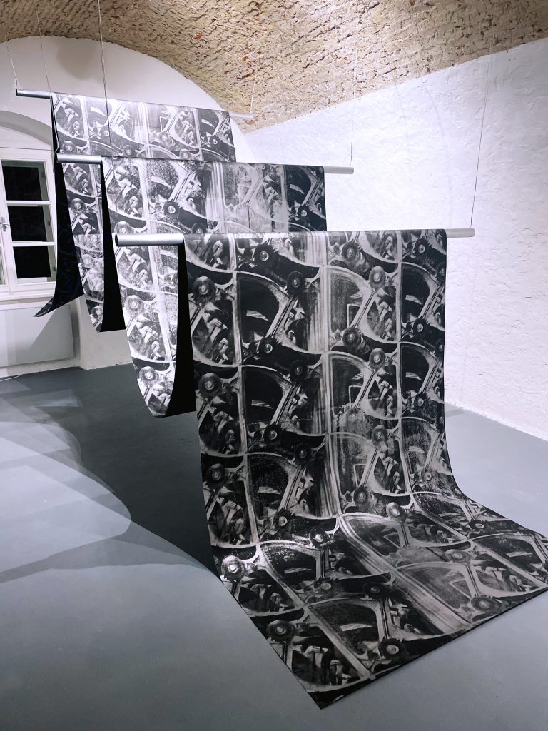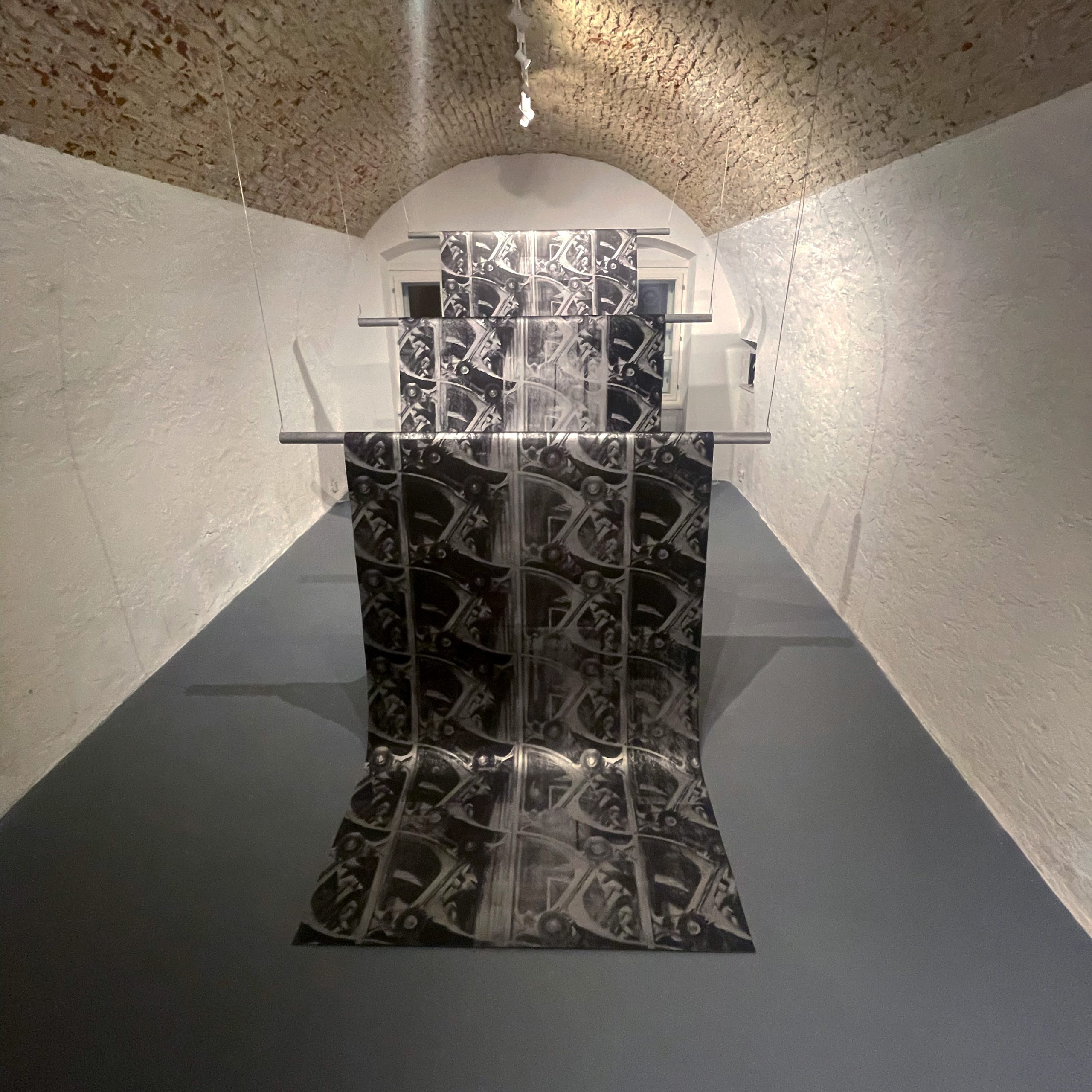 Ich hebe die Rolle über das Aluminiumrohr. Meter für Meter wird entrollt. Wiederholung. Das Objekt hat Körper. Es hat Masse. Ein Luftzug bringt es zum Schwingen. Schritte zur Seite – die Masse verschwindet. Der Druck läuft rundherum.
