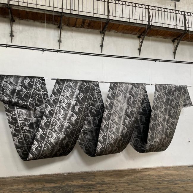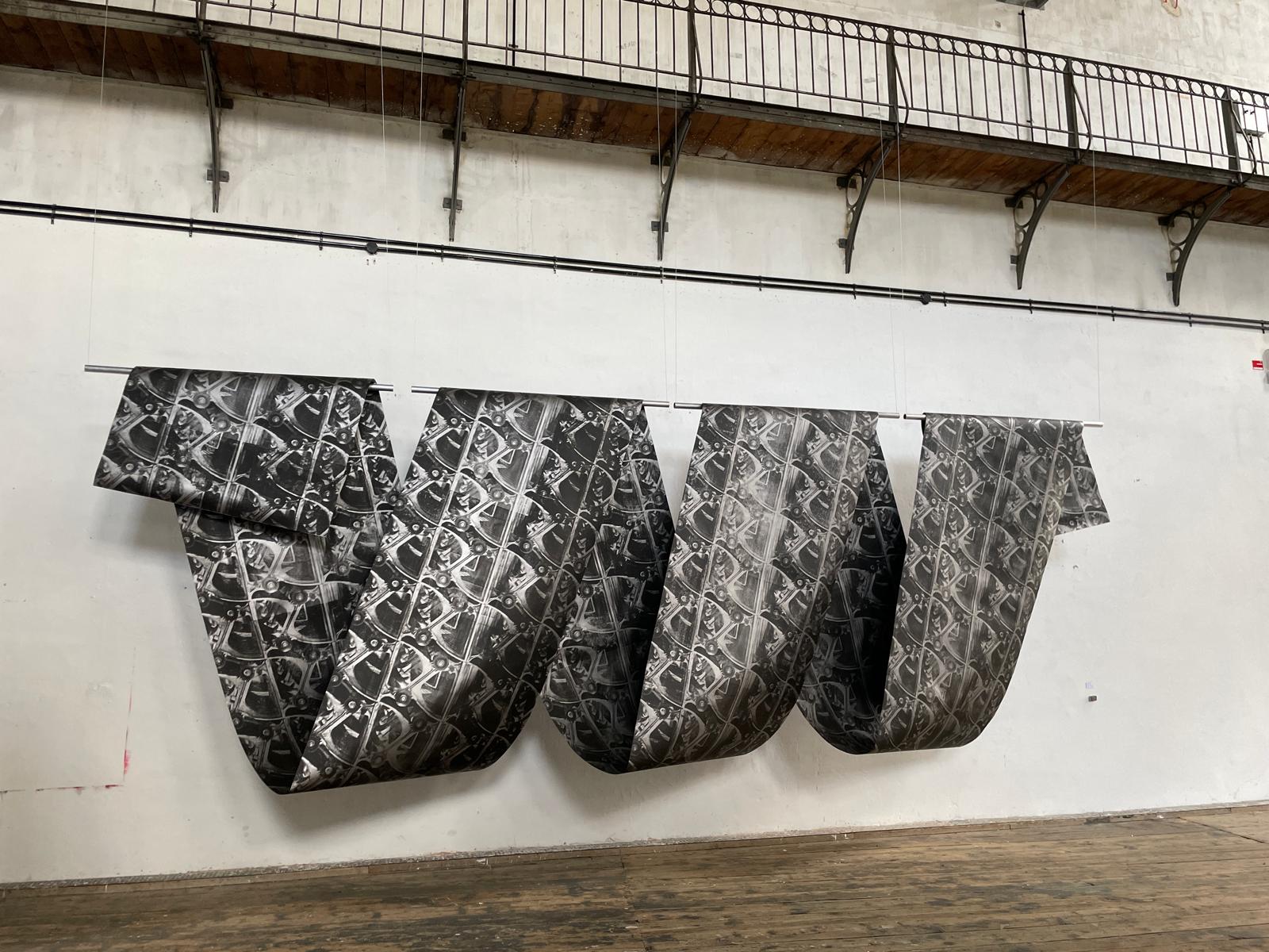 Das Material meiner Arbeit ist Papier. Ein sehr geläufiges Material mit hoher Verbreitung. Die Grundierung ist metallisch. Die Farbgebung ist reduziert. Die verwendete Technik ist Siebdruck. Eine Drucktechnik zur Vervielfältigung. Der Druck zeigt ein sich wiederholendes Muster. Das Muster läuft um das Papier herum. Das Motiv stammt von einem Foto. Das Foto zeigt eine Rolltreppe. Die Rolltreppe steht im Raum. Der Raum ist nicht zum Verweilen gedacht. Die Arbeit ist über vier Aluminiumrohre gelegt. Die Aluminiumrohre sind vom Balkon abgehängt.